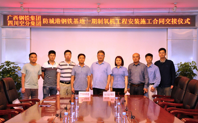 5月17日,(集團(tuán))公司與廣西鋼鐵集團(tuán)有限公司就廣西防城港鋼鐵基地一期制氧機(jī)安裝施工工程,在集團(tuán)辦公樓會(huì)議室舉行了合同交接儀式。廣西鋼鐵集團(tuán)有限公司制氧廠廠長(zhǎng)凌波、四川空分集團(tuán)工程公司副總經(jīng)理李之健、市場(chǎng)總監(jiān)雷娟等出席儀式。