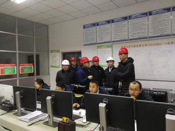會議召開前,在陜川公司董事、總經理謝銀宇的陪同下,全體董事會成員對公司廠區內15000Nm3/h空分裝置的主體設備、中控室、后備系統液體儲槽和托管的略鋼6500Nm3/h空分裝置區域進行了全面視察,現場聽取了技術人員對生產運行、操作、質量把控等工作介紹。