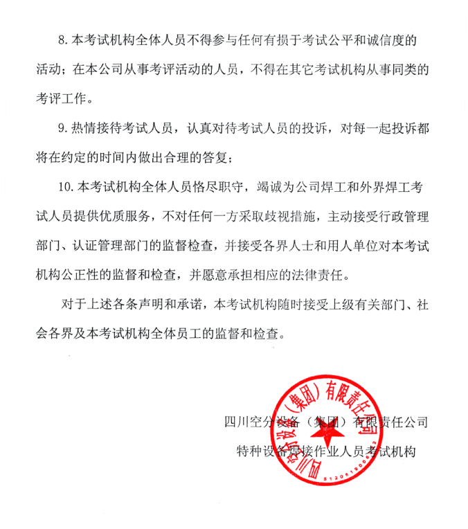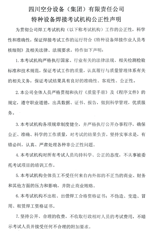四川空分設(shè)備(集團(tuán))有限責(zé)任公司——特種設(shè)備焊接考試機(jī)構(gòu)公正性聲明