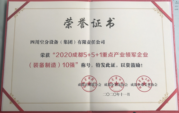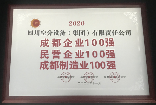 近日,我公司榮獲2020年度“成都百強企業”“成都民營百強企業”“成都制造業百強企業”以及“2020成都5+5+1重點產業領軍企業(裝備制造)10強”等榮譽稱號。這代表著客戶、行業和社會對四川空分集團的肯定和認可。 不忘初心,砥礪前行。四川空分集團未來將繼續堅持走創新之路,推動企業高質量發展,充分發揮成都“百強企業”在推動產業發展中的引領和帶動作用,為國家經濟社會發展做出更大的貢獻。