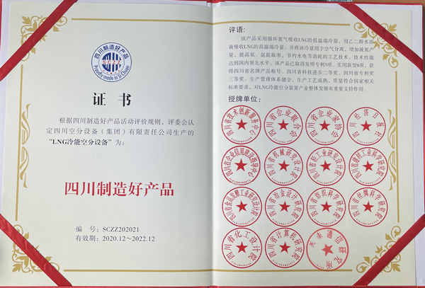 根據四川制造好產品活動評價規則,我公司生產的“LNG冷能空分設備”被評為“四川制造好產品”。目前該產品已取得發明專利3項、實用新型專利8項,獲得了四川省名牌產品稱號、四川省科技進步二等獎、四川省專利獎三等獎等榮譽。