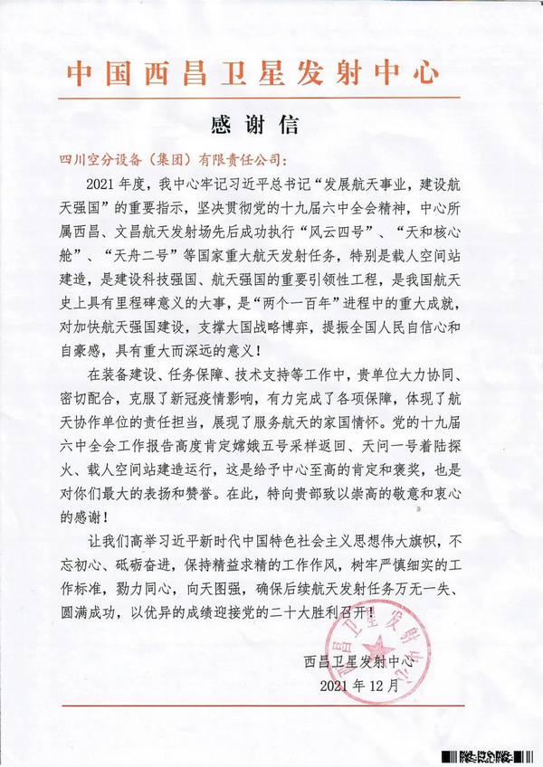 近日,我公司再次收到中國西昌衛(wèi)星發(fā)射中心發(fā)來的感謝信。發(fā)射中心對我公司在“風云四號”、“天和核心艙”、“天舟二號”等國家重大航天發(fā)射任務,特別是載人空間站建造中提供的裝備建造、任務保障、技術(shù)支持等工作服務表示最衷心地感謝。
