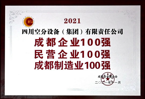 2021年11月,我公司再次被成都企業聯合會頒證授予“成都企業100強”、成都“民營企業100強”、“成都制造業100強”。這也是我公司連續多年獲得這些稱號。