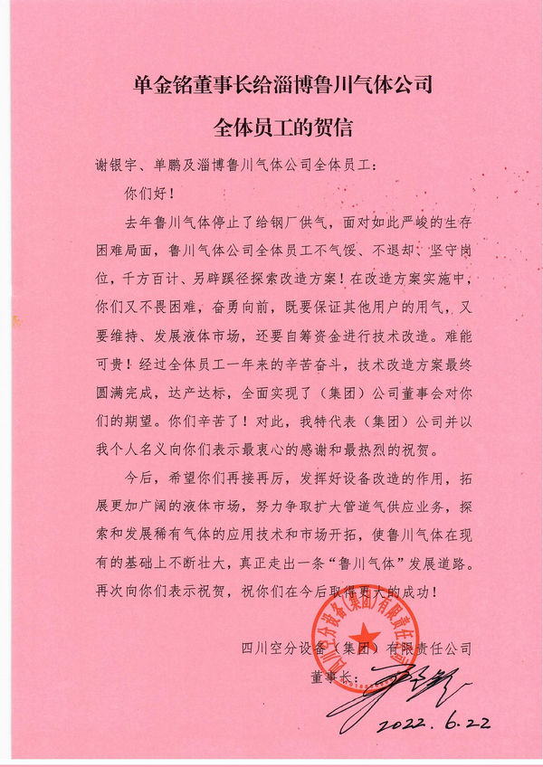 去年魯川氣體停止了給鋼廠供氣,面對如此嚴峻的生存困難局面,魯川氣體公司全體員工不氣餒、不退卻、堅守崗位,千方百計、另辟蹊徑探索改造方案!在改造方案實施中,你們又不畏困難,奮勇向前,既要保證其他用戶的用氣,又要維持、發展液體市場,還要自籌資金進行技術改造。難能可貴!經過全體員工一年來的辛苦奮斗,技術改造方案最終圓滿完成,達產達標,全面實現了(集團)公司董事會對你們的期望。你們辛苦了!對此,我特代表(集團)公司并以我個人名義向你們表示最衷心的感謝和最熱烈的祝賀。