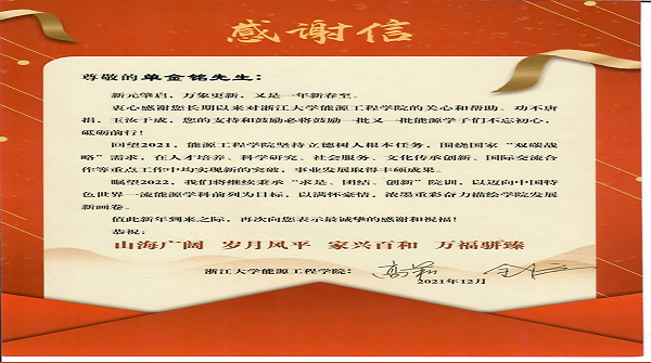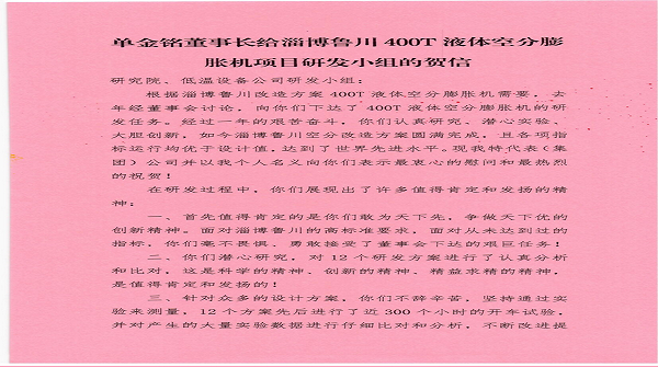 單金銘董事長(zhǎng)給淄博魯川400T液體空分膨脹機(jī)項(xiàng)目研發(fā)小組的賀信