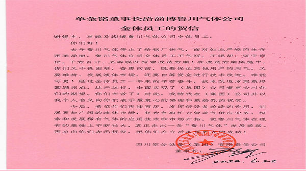單金銘董事長(zhǎng)給淄博魯川氣體公司 全體員工的賀信