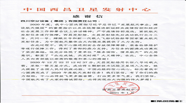 西昌衛(wèi)星發(fā)射中心給我公司發(fā)來感謝信——對我公司在中國航天事業(yè)發(fā)展中的貢獻表示感謝